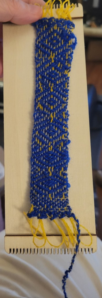 This bookmark is the first time I’ve followed a pattern, Diamond Twill Bookmark by Spruce & Linen. I made it for a coworker who is lovely, kind, and an amazing problem-solver. Both warp and weft are wool, crewel thread from an embroidery project. I purchased them from At the Sign of the Golden Scissors; a mix of different brands, so I’m not sure what these are now.