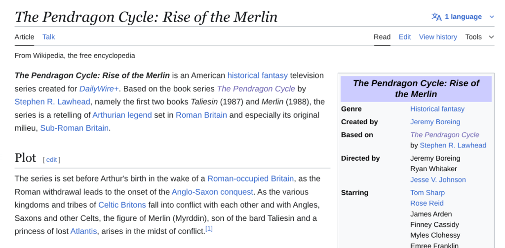 For months now, when I scroll the Reddit app, I get ads for the Daily Wire (?!)’s new show (??!!), The Pendragon Cycle: The Rise of the Merlin. I am low-key obsessed.